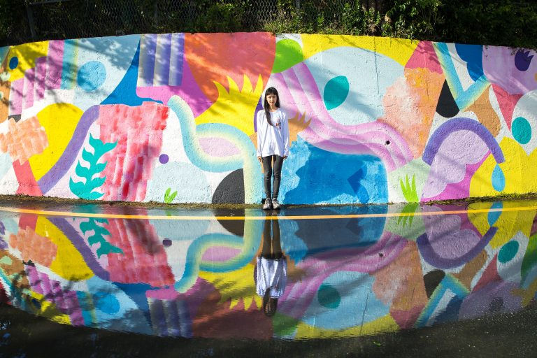 Mina Hamada est née en Louisiane, elle grandi à Tokyo et étudie le design et l’illustration. Aujourd’hui, basée à Barcelone, elle produit un travail qu’elle nous décrit comme « instable et organique ». Sur toiles ou sur murs, peu importe l’échelle, ses formes sont douces et mouvantes, ses couleurs chaudes et lumineuses.